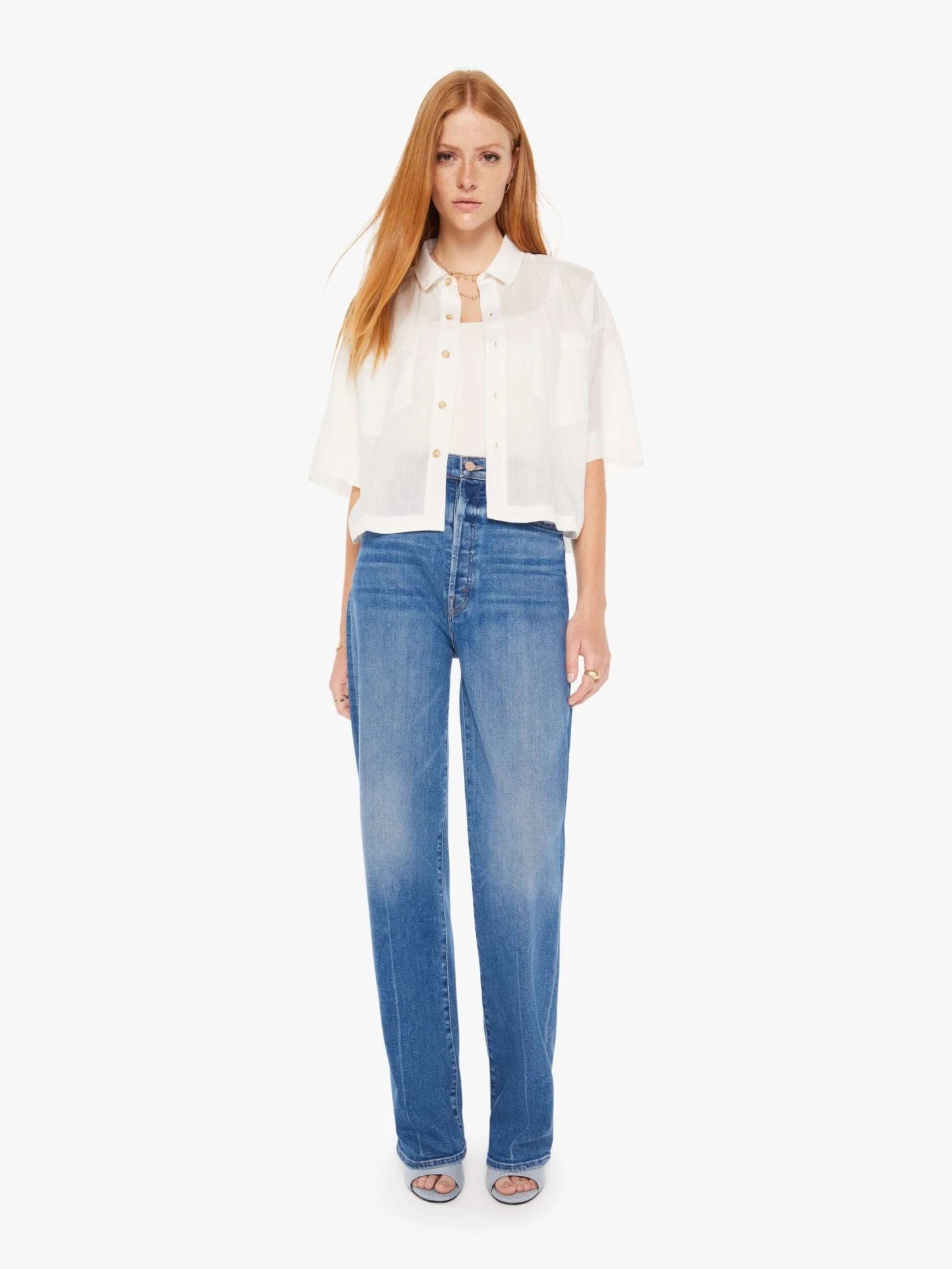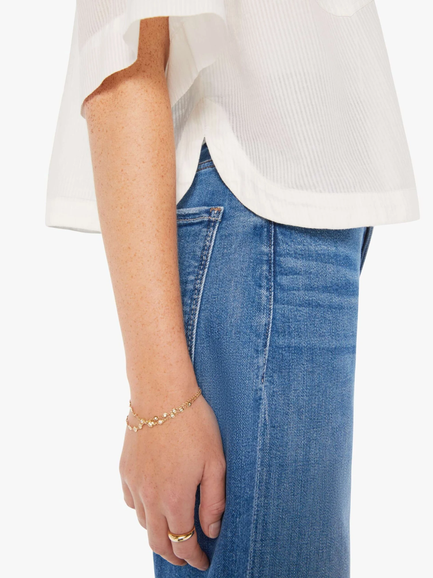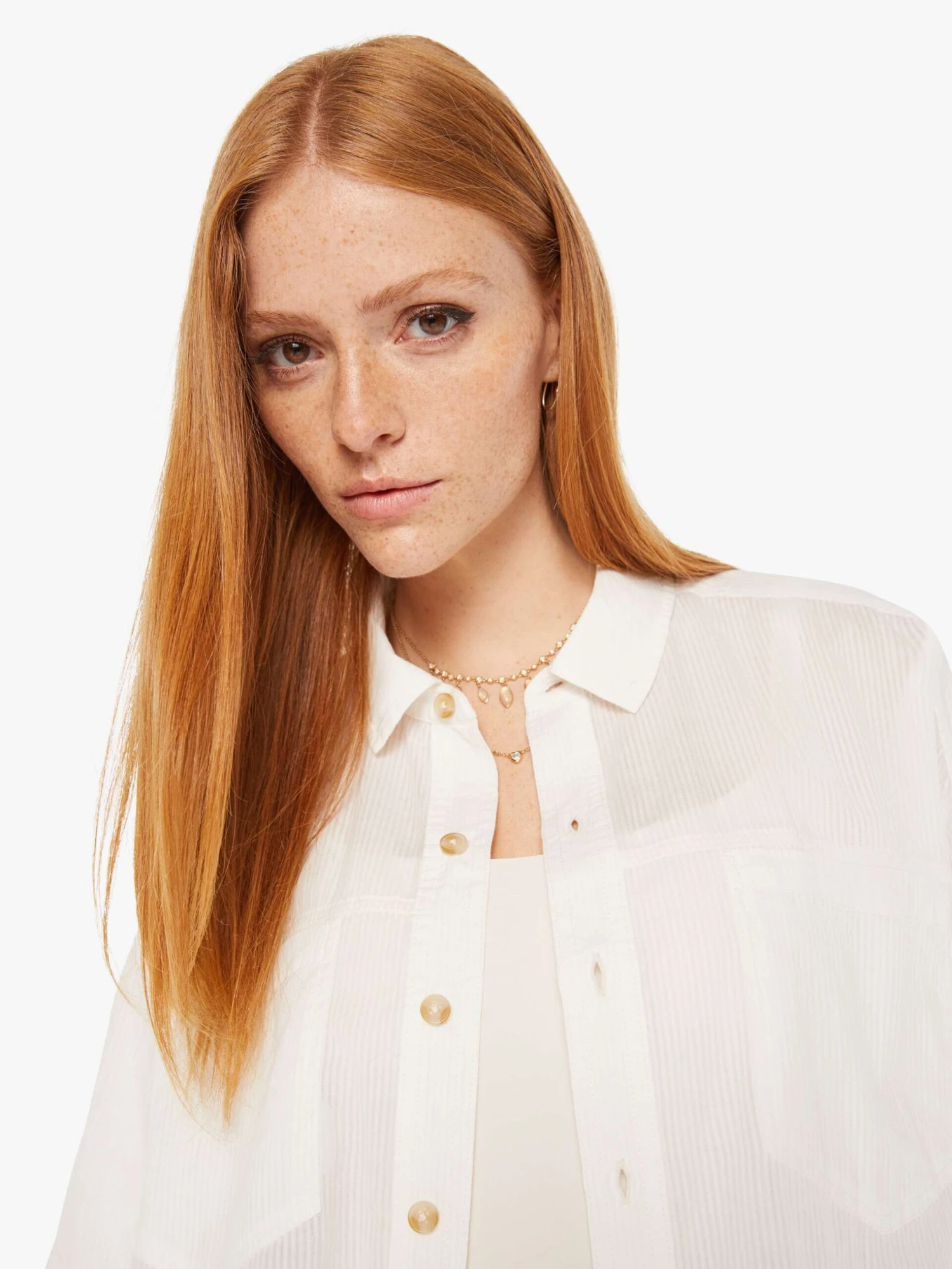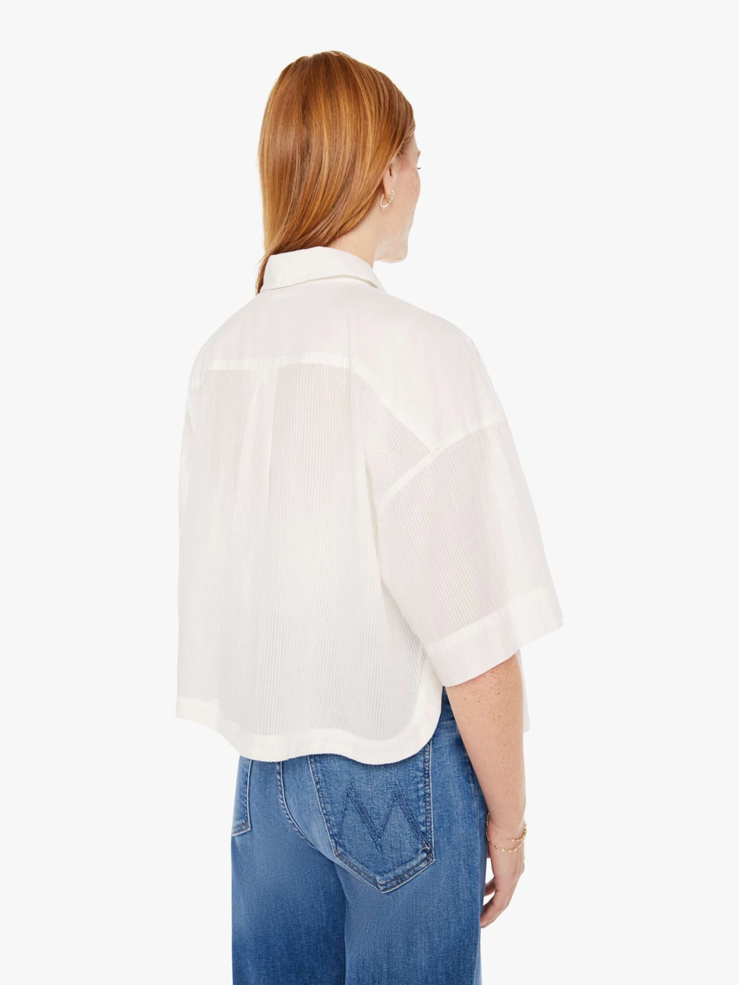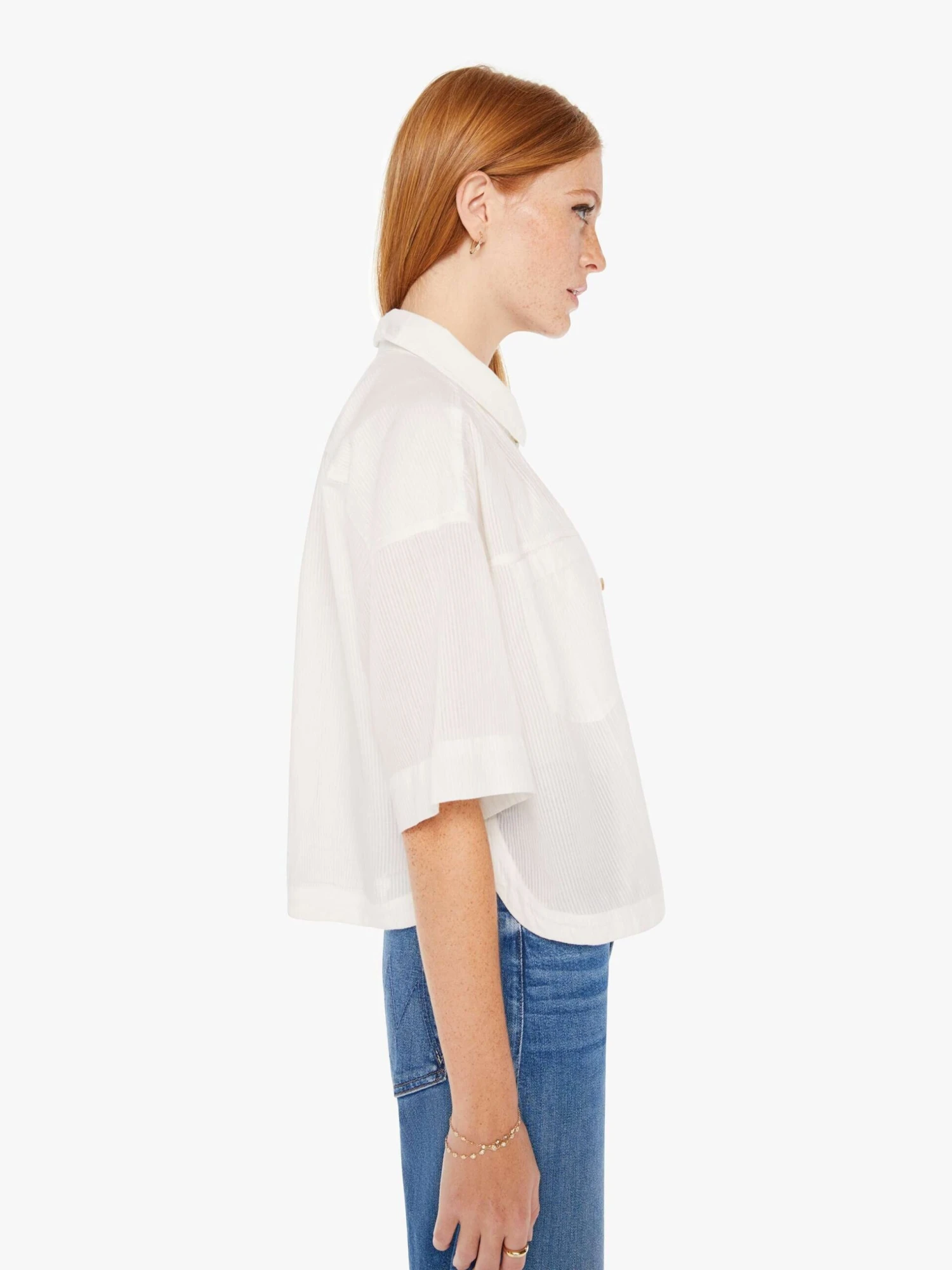 Only at MOTHER. A collared button up with drop shoulders, short sleeves, an oversized patch pocket and a loose, boxy fit. Cut from 100% cotton, Egret is a semi-sheer white fabric with vertical stripes.