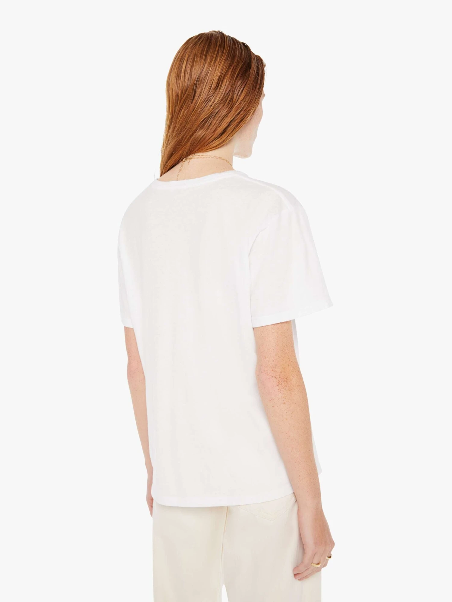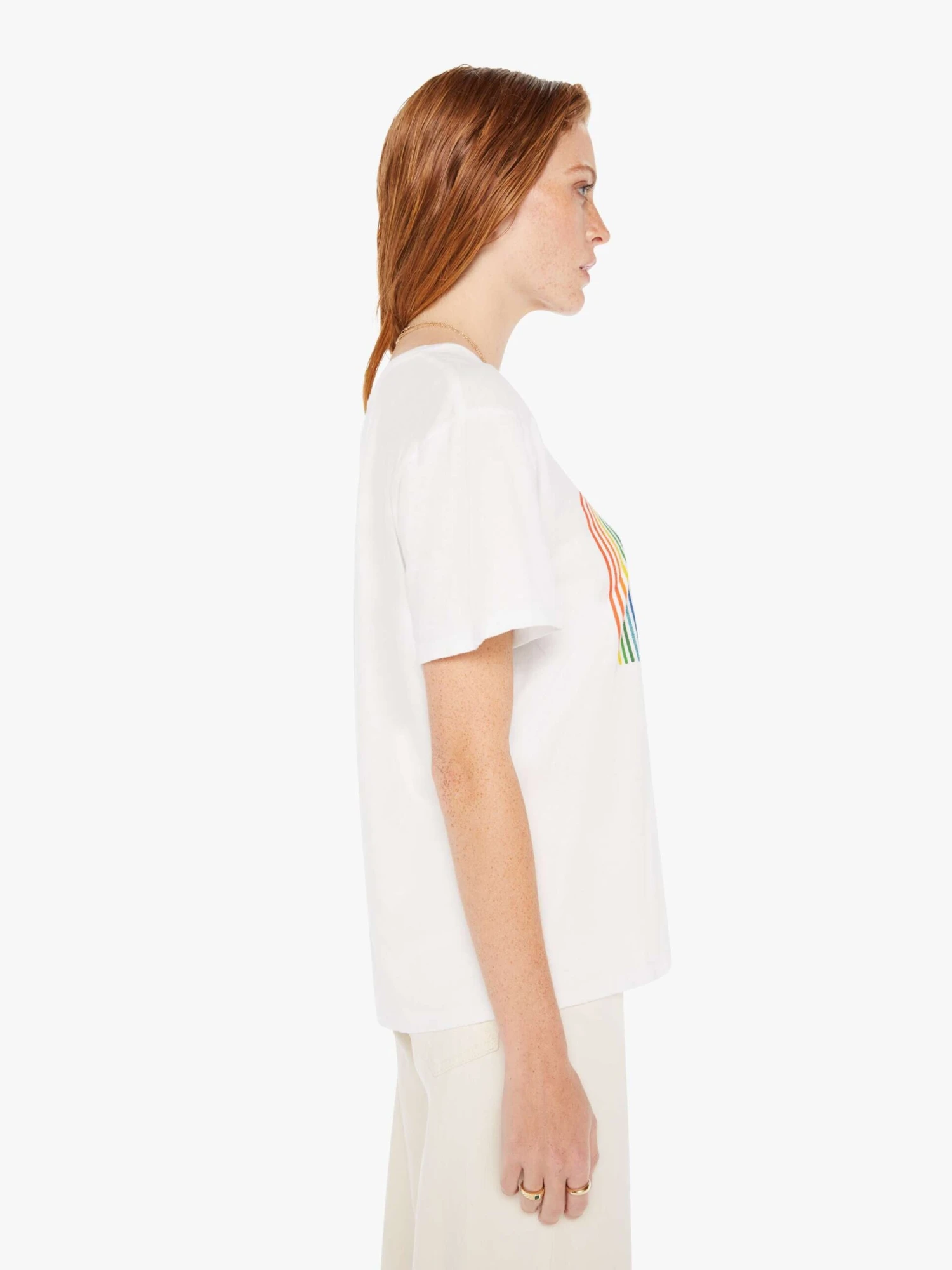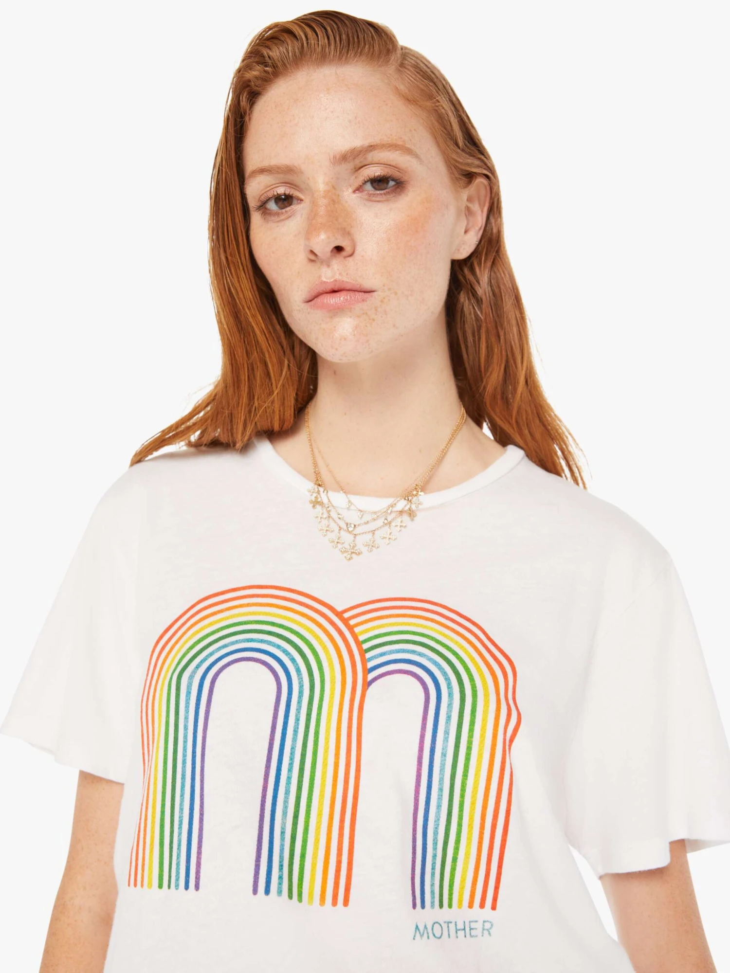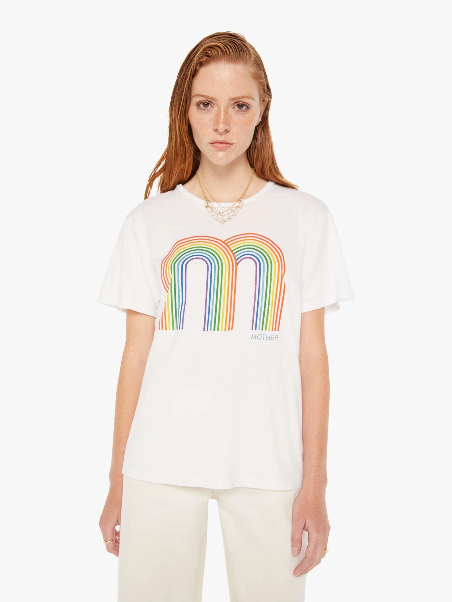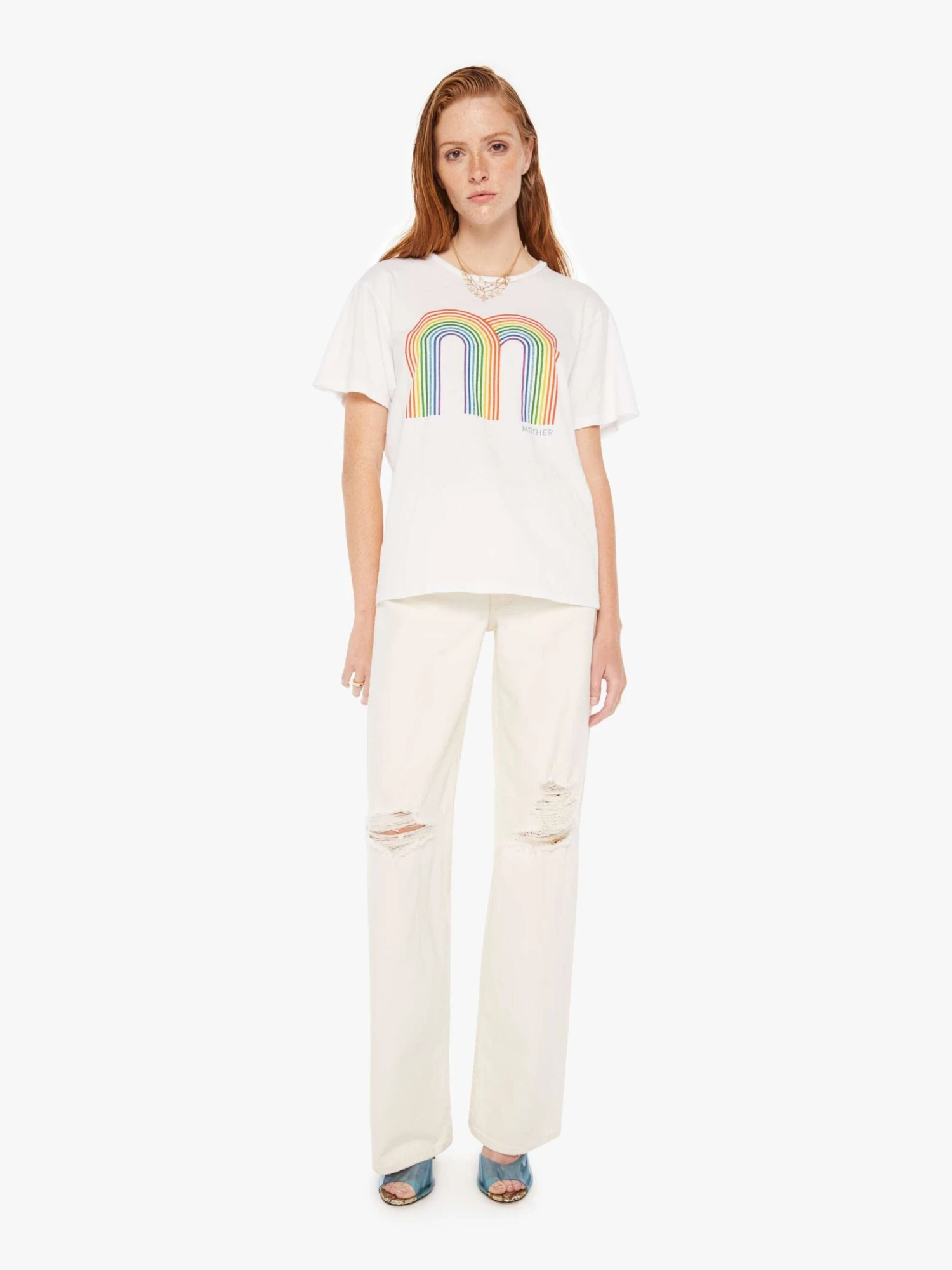 You know hue. A crewneck tee with an oversized fit and a clean hem. Made from a blend of recycled cotton, the white tee features a double rainbow graphic in the shape of an “M” on the front.