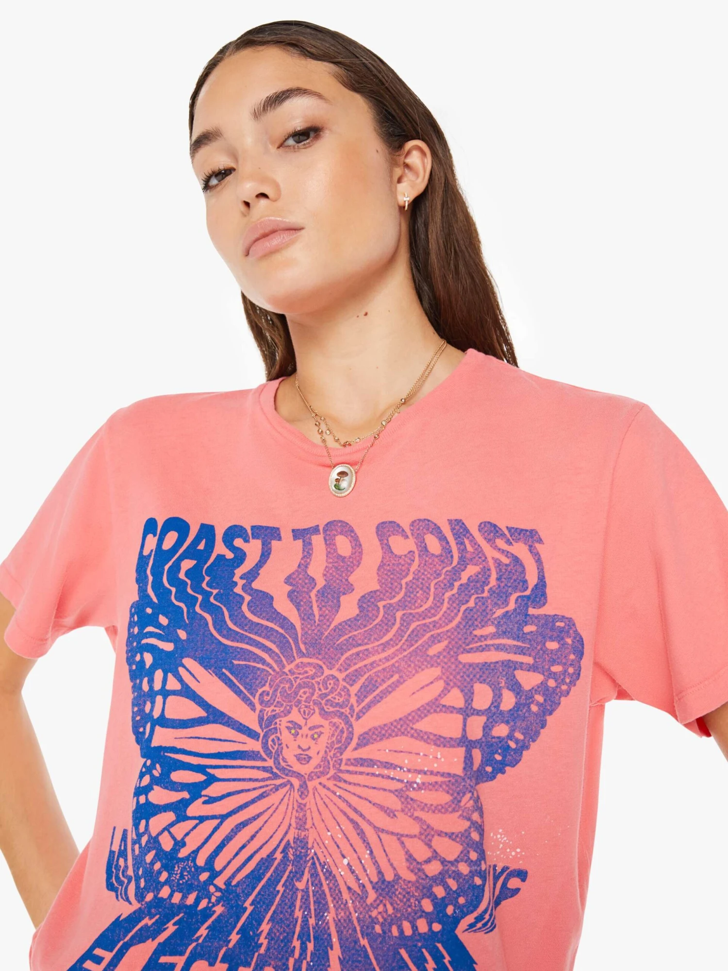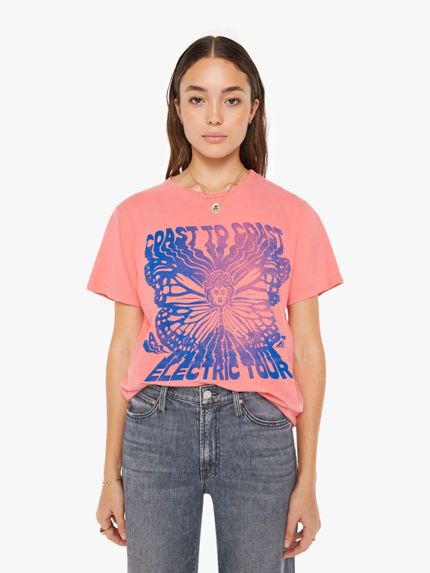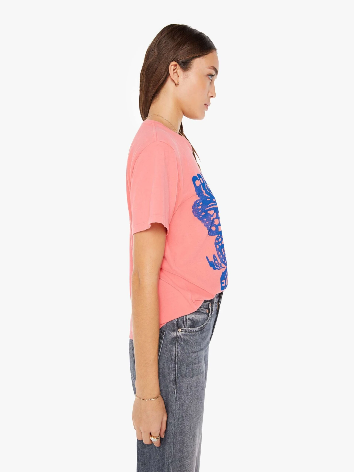 On tour. A crewneck tee with an oversized fit and a clean hem. Made from a recycled cotton blend, the pink tee features a blue psychedelic butterfly graphic with text on the front.