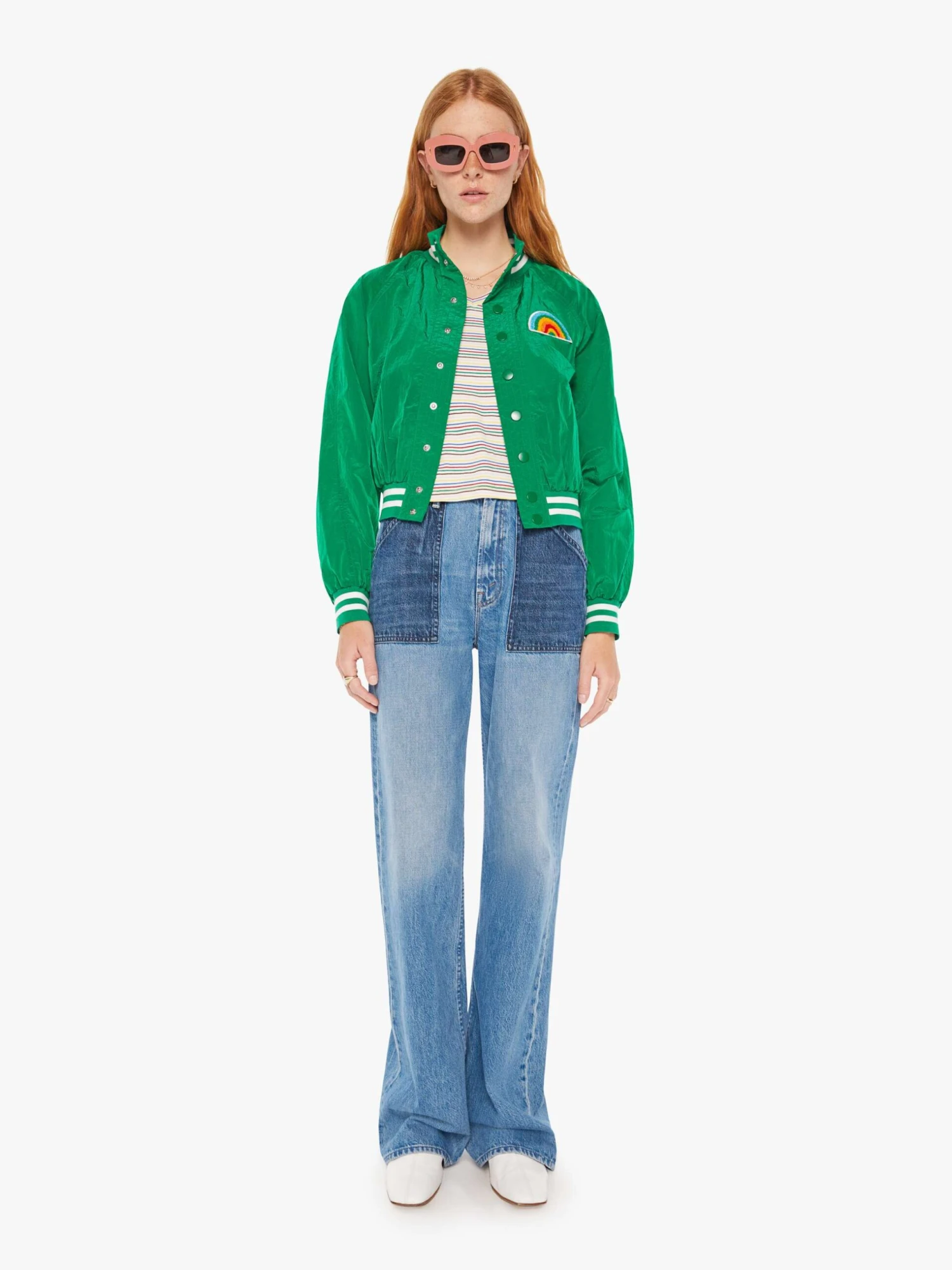 Green machine. A lightweight windbreaker with a high neck, bat-wing sleeves, slit pockets, ribbed hems and a cropped fit. Designed in green, the jacket features white stripes at the hems, a rainbow patch at the chest and monochrome snaps down the front.
