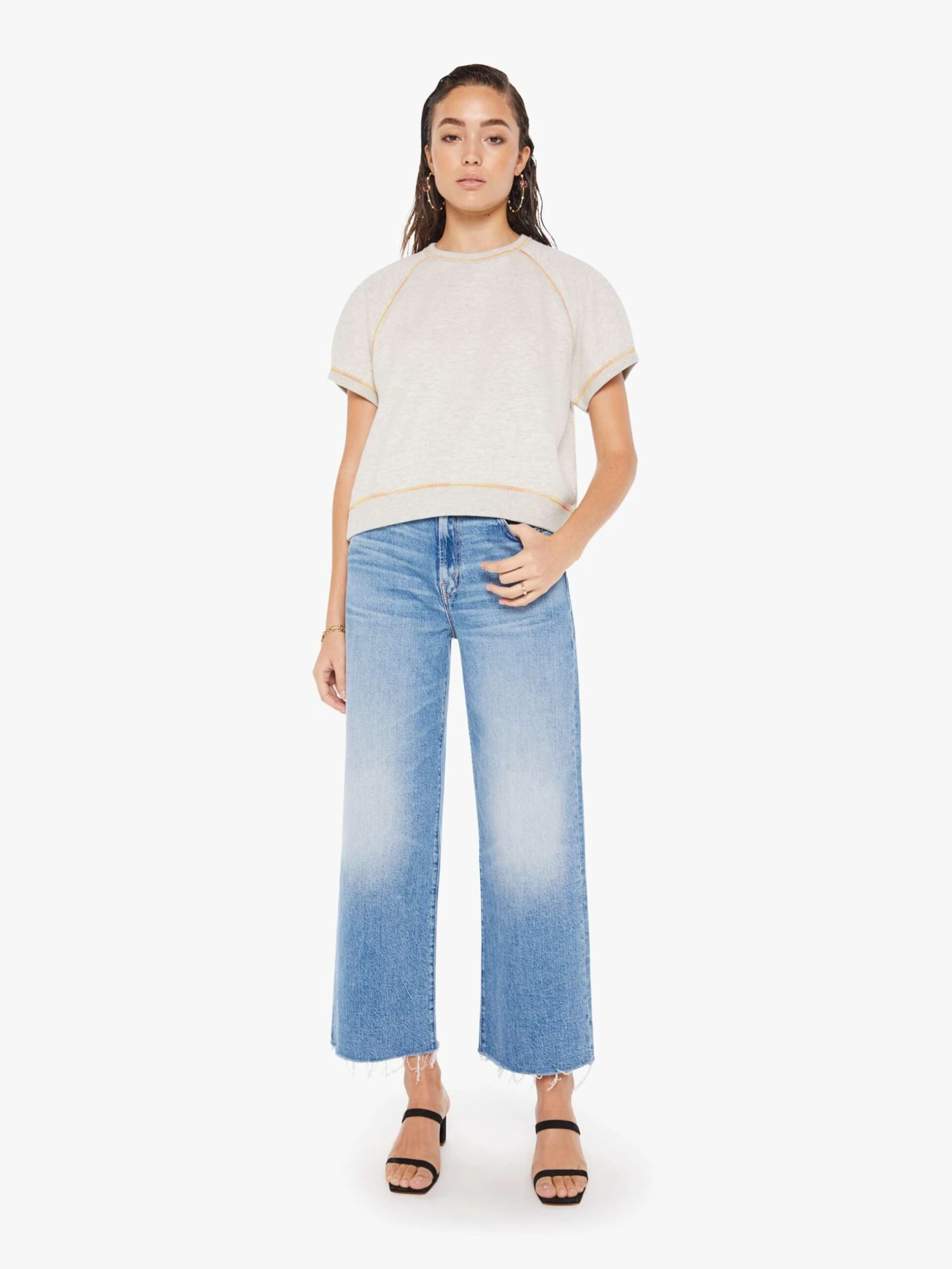 Don’t sweat it. A short sleeve raglan sweatshirt with ribbed hems and a loose, boxy fit. Cut from a cotton blend in heathered cream, the top features hand-painted orange contrast stitching.
