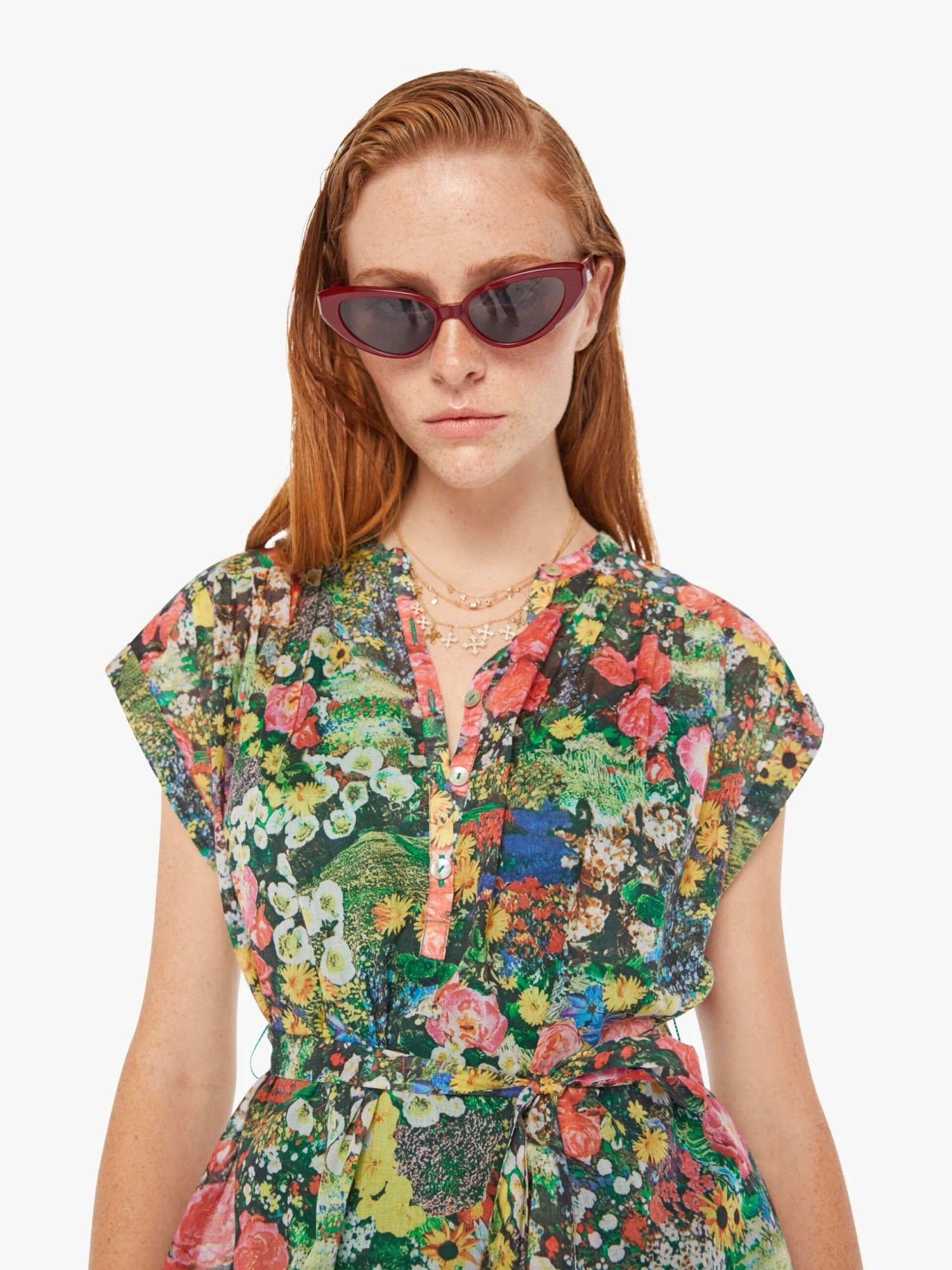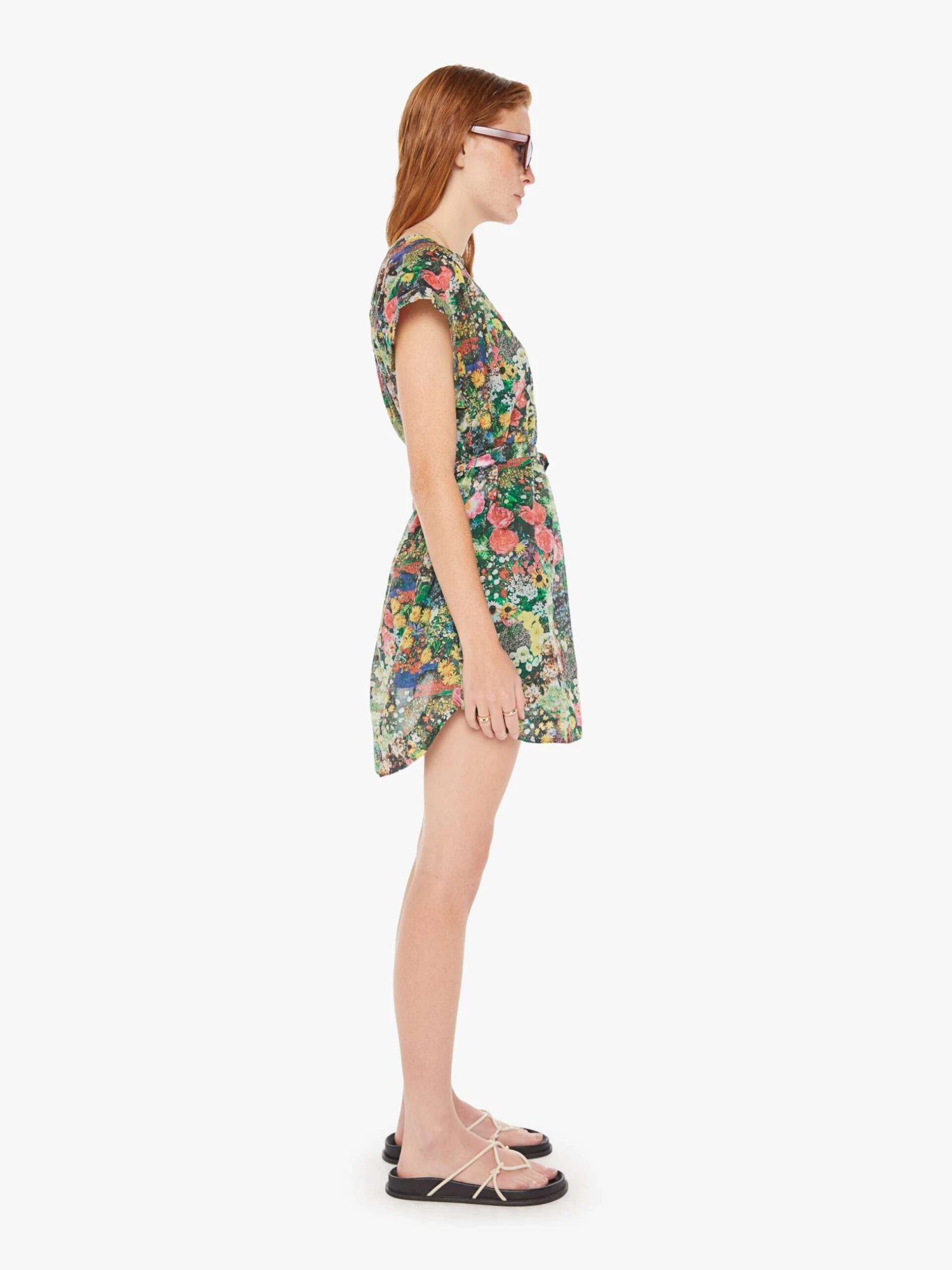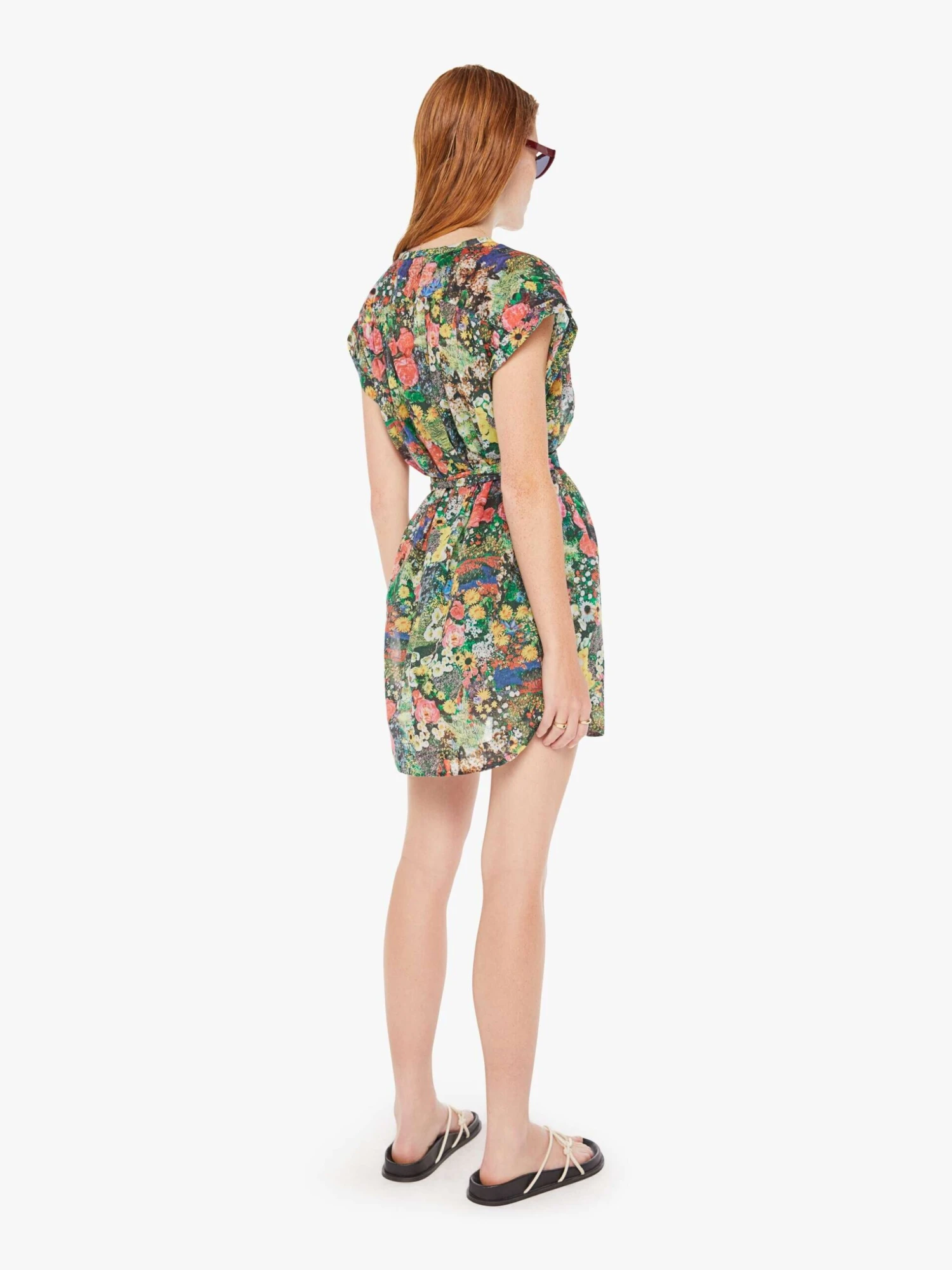 Picture perfect. A flowy shirt dress with a buttoned V-neck, short boxy sleeves, a tied waist, slit pockets and thigh-grazing hem. Made from semi-sheer 100% cotton, Pretty As A Picture is a colorful floral print. The dress is designed with a green slip.