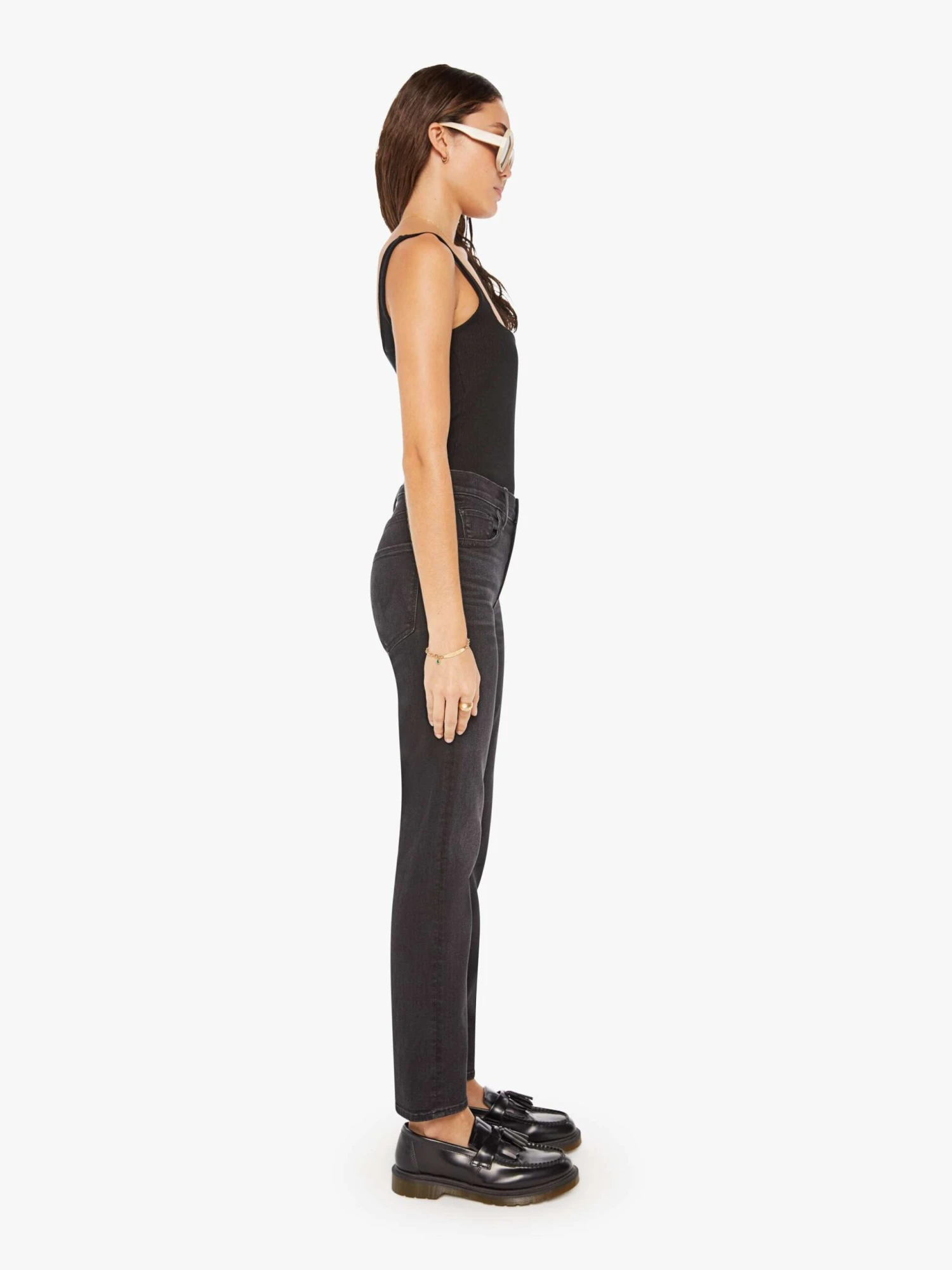 Revving up. High-waisted jeans with a narrow straight leg, zip fly and a 29-inch inseam with a clean hem. Cut from stretch denim, Vroom is a dark black wash with tonal hardware.