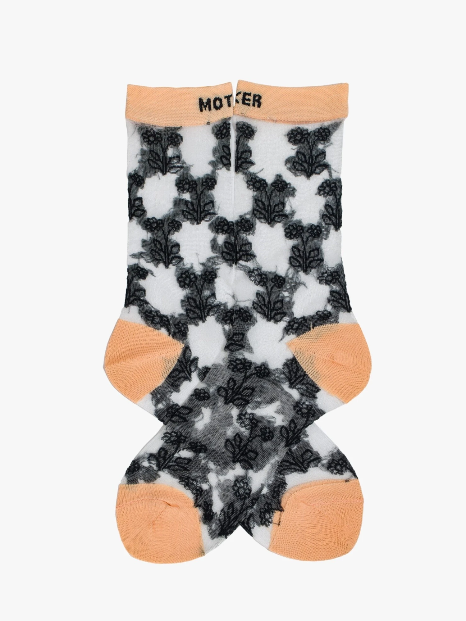 Pardon my French. Tube socks with a subtle message from MOTHER. Shown here in sheer white with black floral embroidery and peach details.