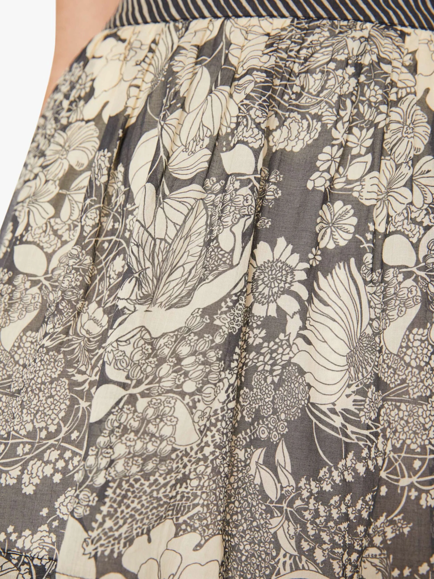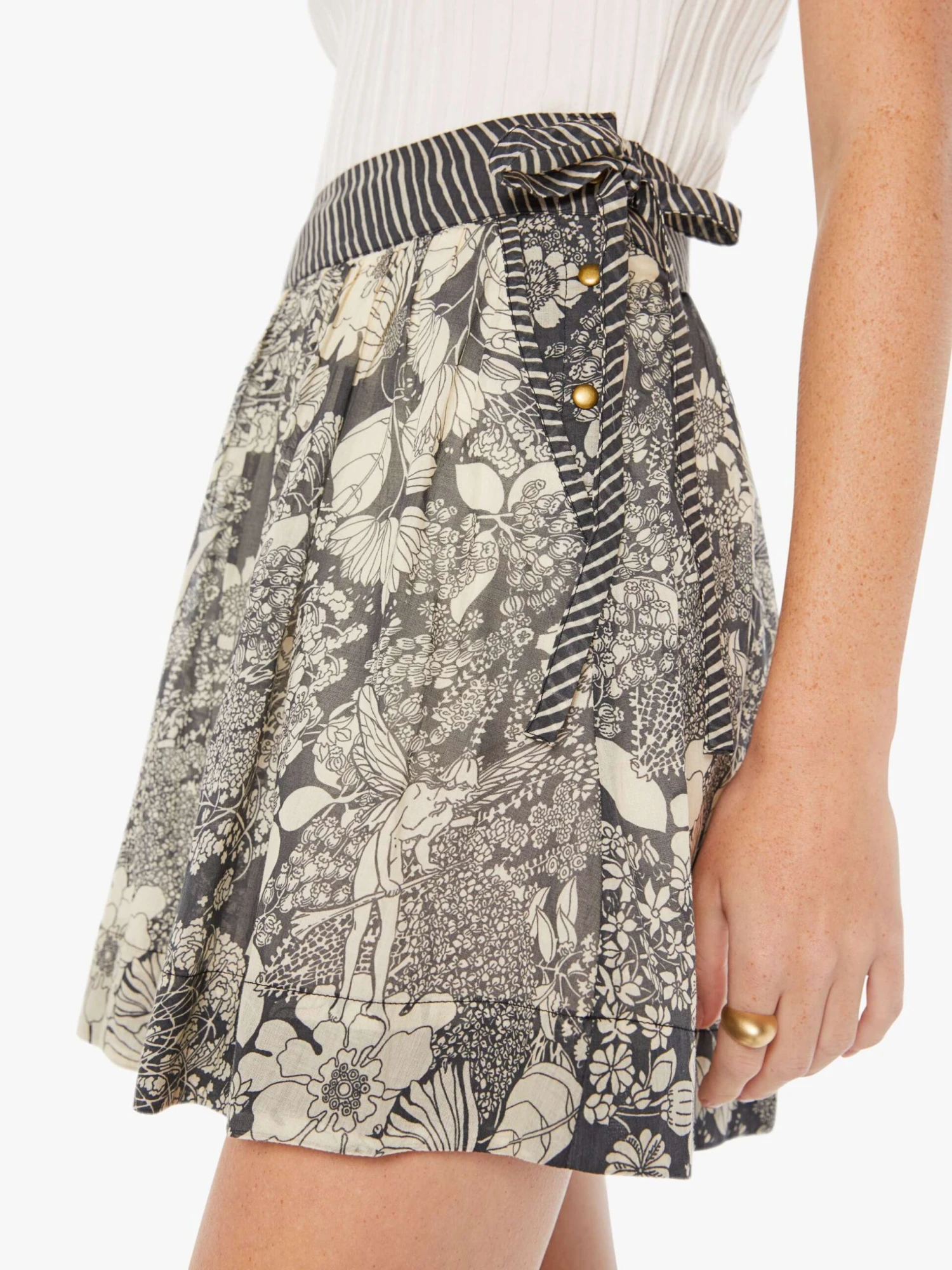 Once upon a time. A lightweight mini skirt with a high waist that snaps and ties, slit pockets, a flowy fit and a hem that hits mid-thigh. Cut from 100% cotton, French Fairy Tale is a faded black and cream floral print.
