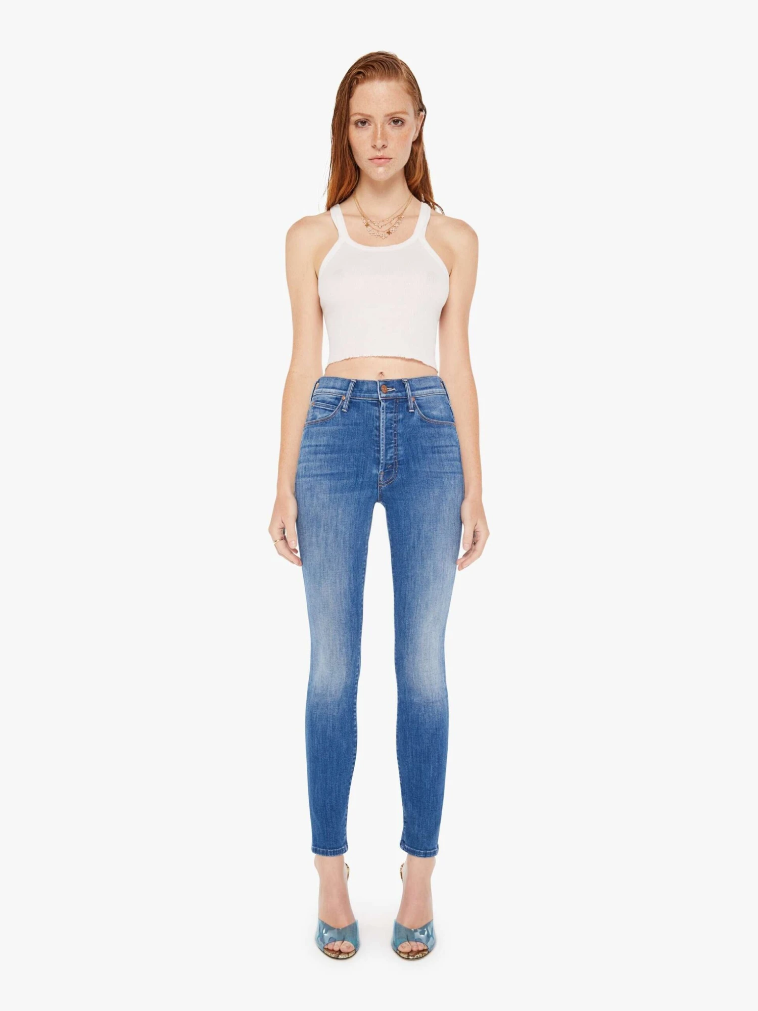This high-rise skinny jean has a 29-inch inseam and a clean hem. Made from denim with a touch of stretch, We Got The Beat is a mid-blue wash with whiskering and fading at the knee.