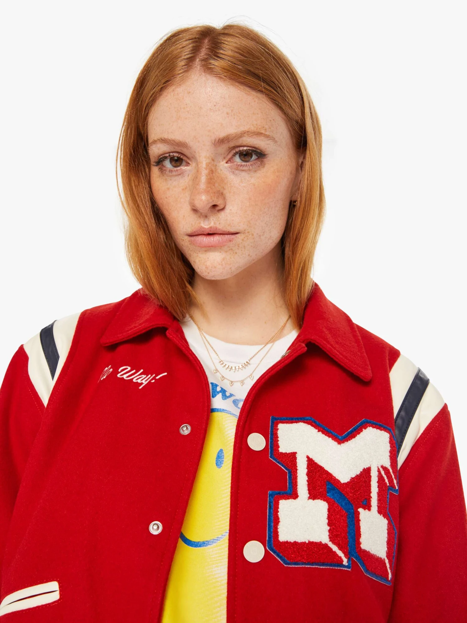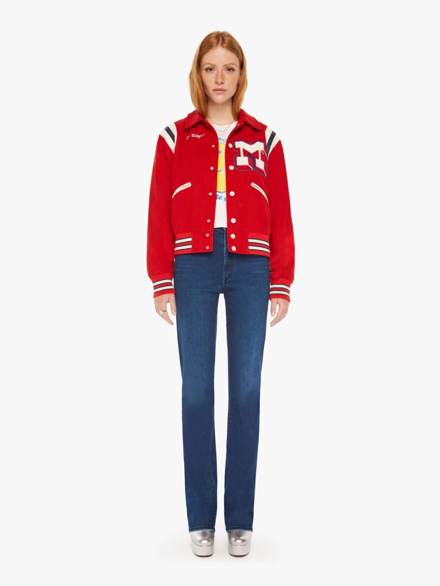 Out of bounds. A vintage-inspired varsity jacket with drop shoulders, slit pockets, ribbed hems and snaps down the front. Made from a wool blend in red, the collared jacket is detailed with faux-leather stripes on the shoulders and an M-shaped patch on the chest. It’s lined with a silky white fabric with blue stars.