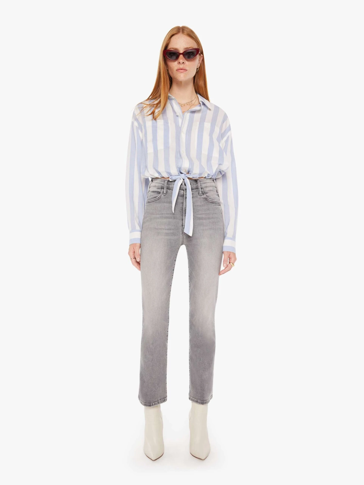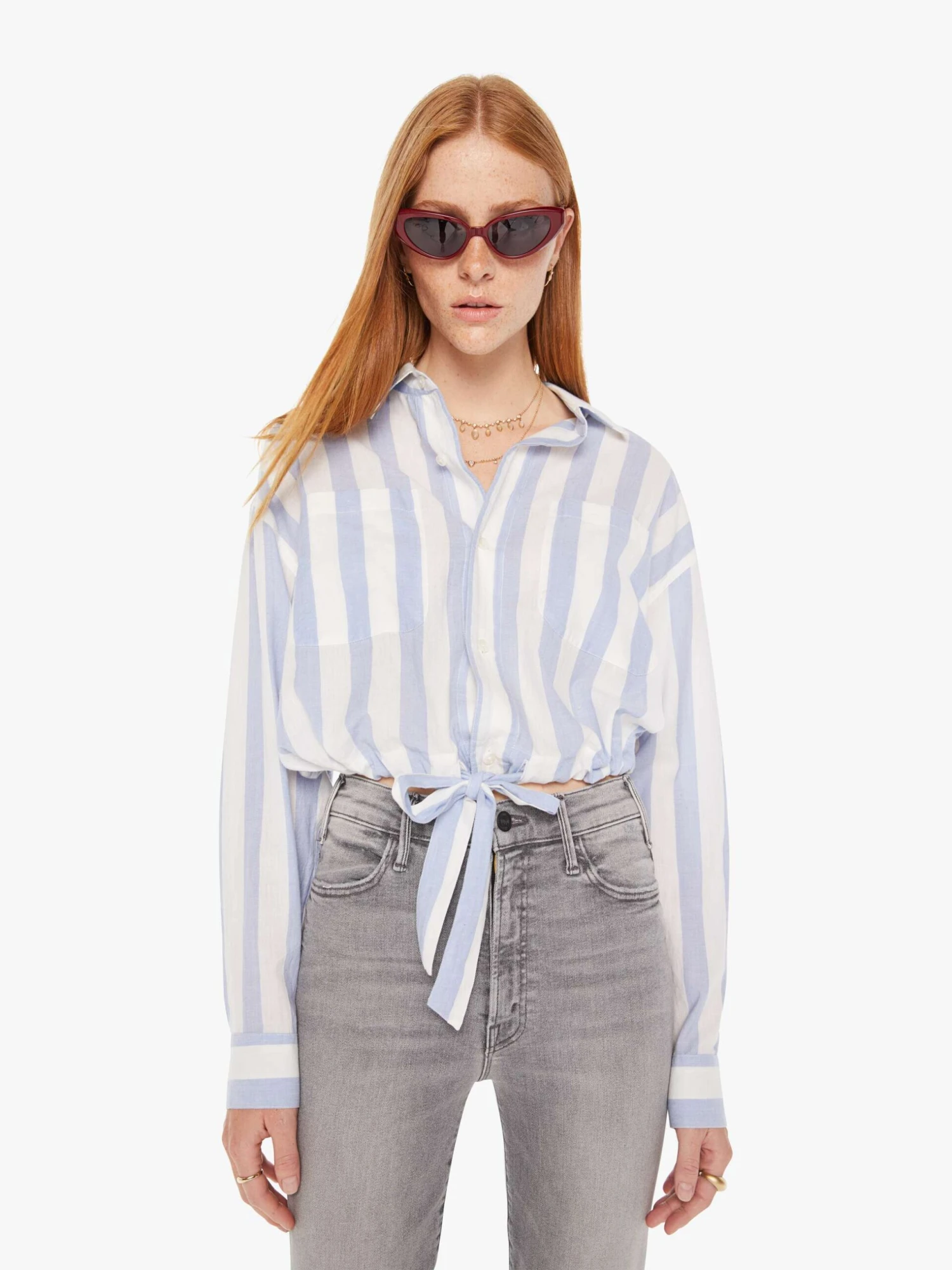 Espresso yourself. A collared button-up with drop shoulders, long sleeves and a cropped hem that ties. Made from 100% cotton, Cafe Culture is designed in light blue and white stripes.