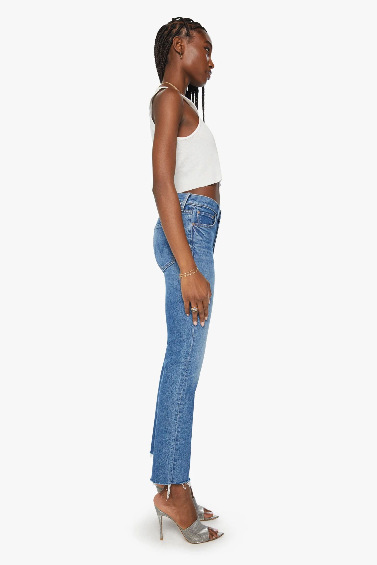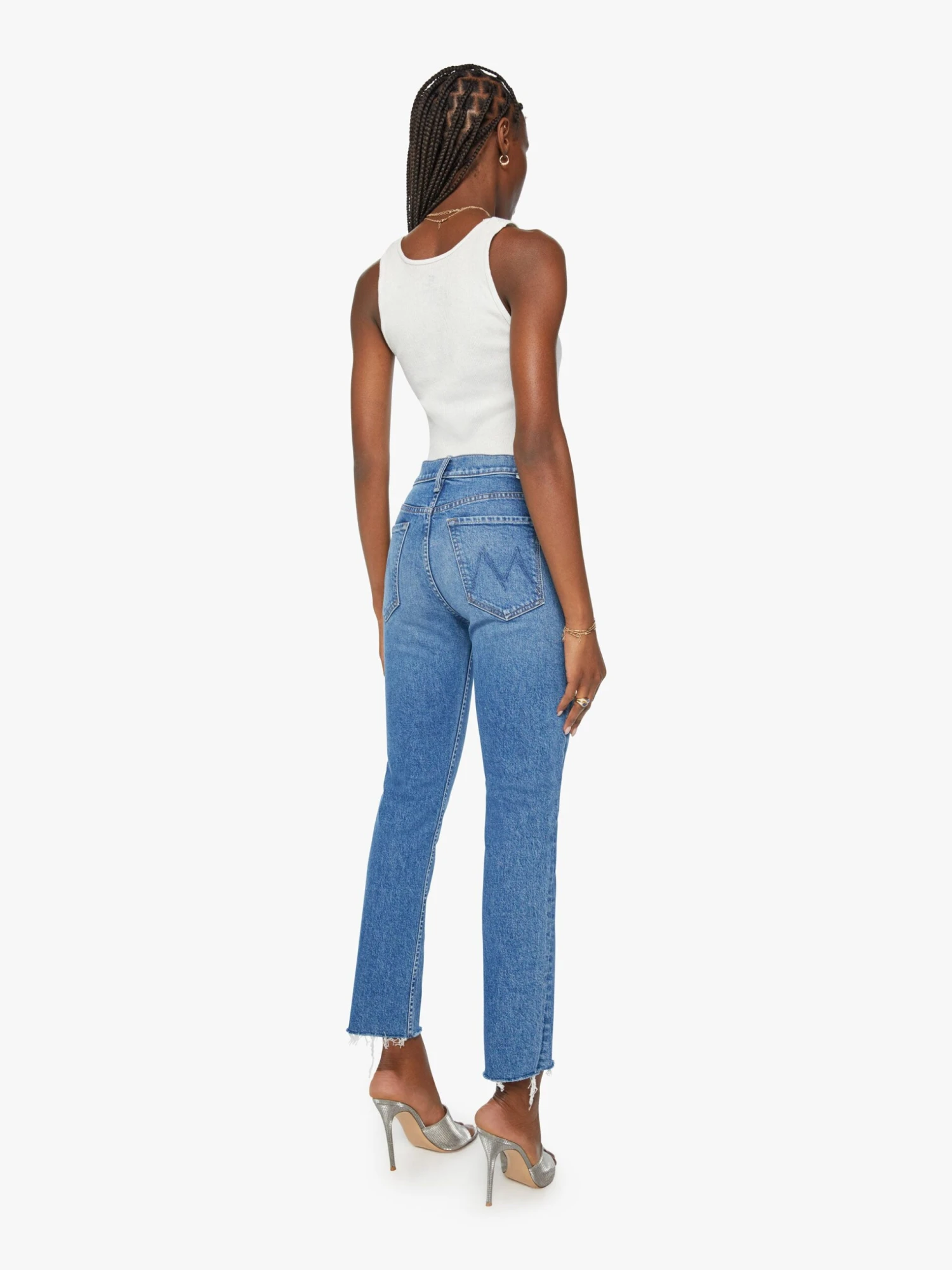 Byte me. High-rise jeans with a straight leg, button fly, ankle-length inseam and a frayed hem. Made from semi-rigid denim, Arigato Mr. Roboto is a mid-blue wash with whiskering and fading at the knee.