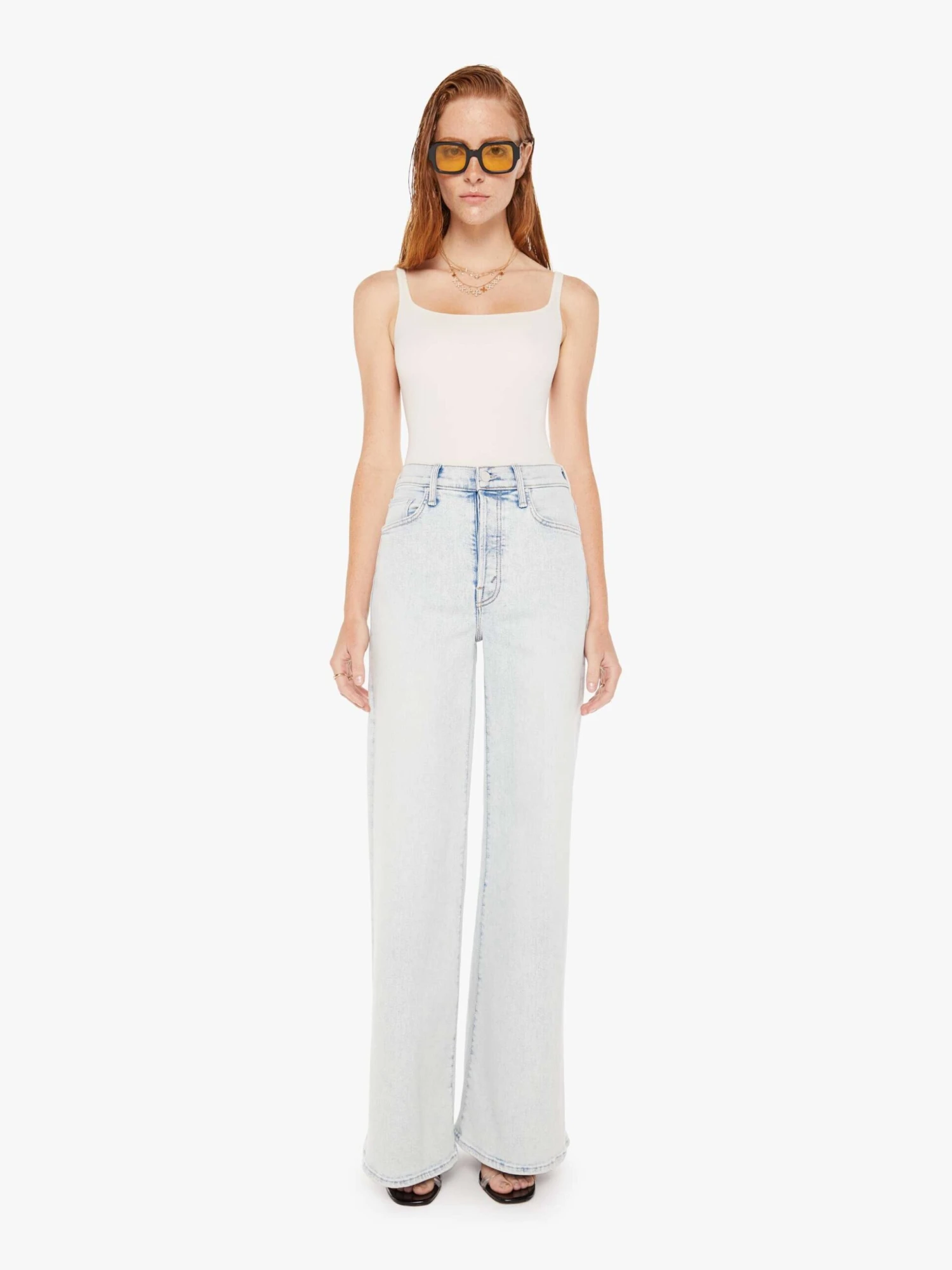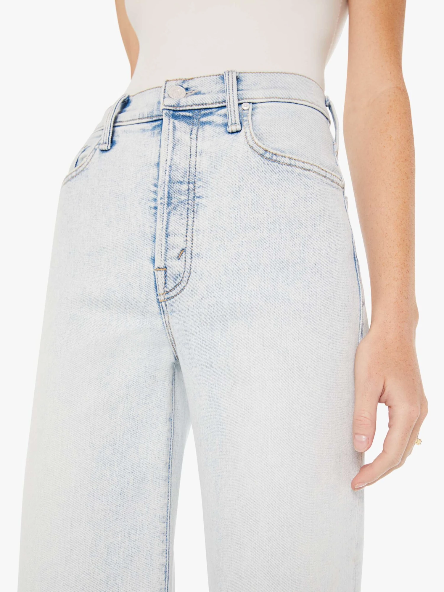 Meet me at the mall. This iconic high-waisted wide leg fit has a button fly, 31-inch inseam and clean hem. Cut from denim with a touch of stretch, Glamour Shot is a super light blue wash with slightly darker seams and fading throughout.