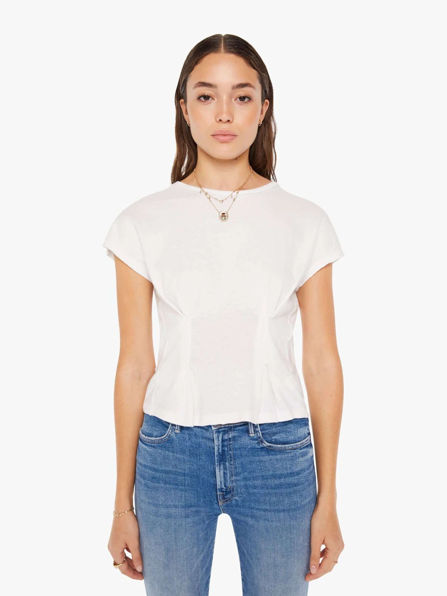Only at MOTHER. A classic crewneck with extra-short sleeves and pintuck details at the chest. The tee is made from a recycled cotton blend in white.