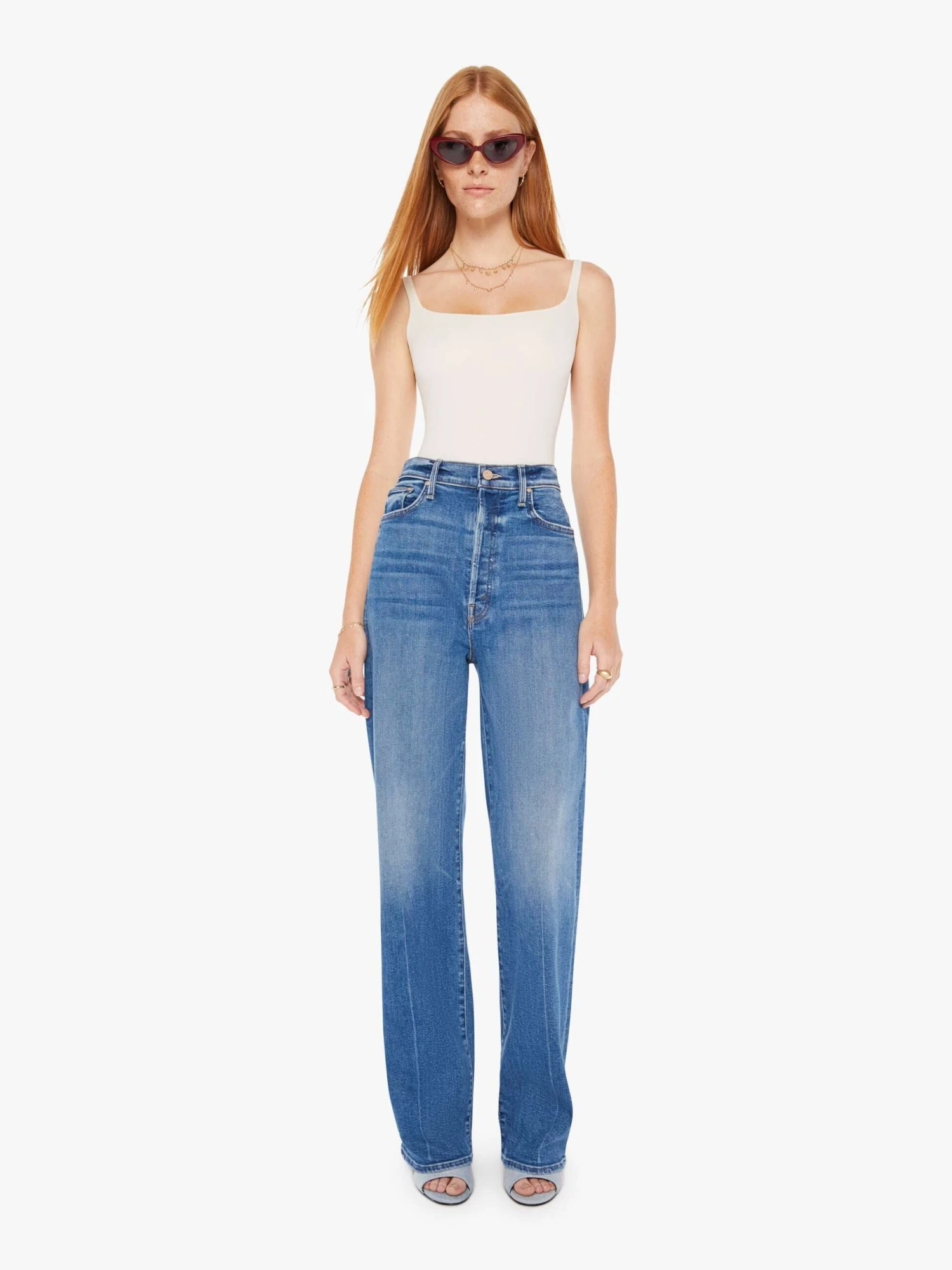 Drawn together. Super high-waisted jeans with a loose fit, wide leg and 32-inch inseam with a clean hem. Cut from denim with a touch of stretch, Opposites Attract is a mid-blue wash with whiskering and fading at the knee.