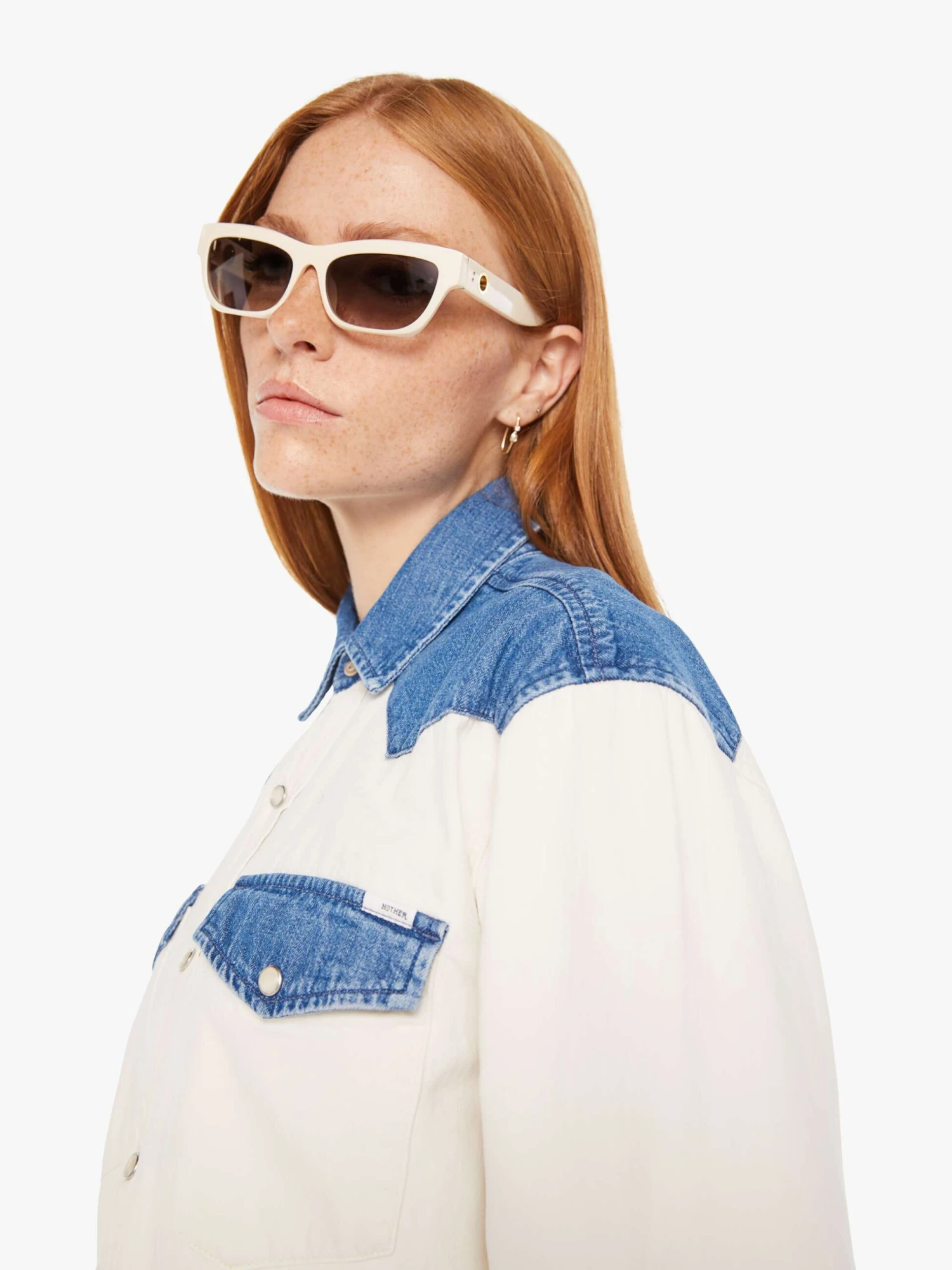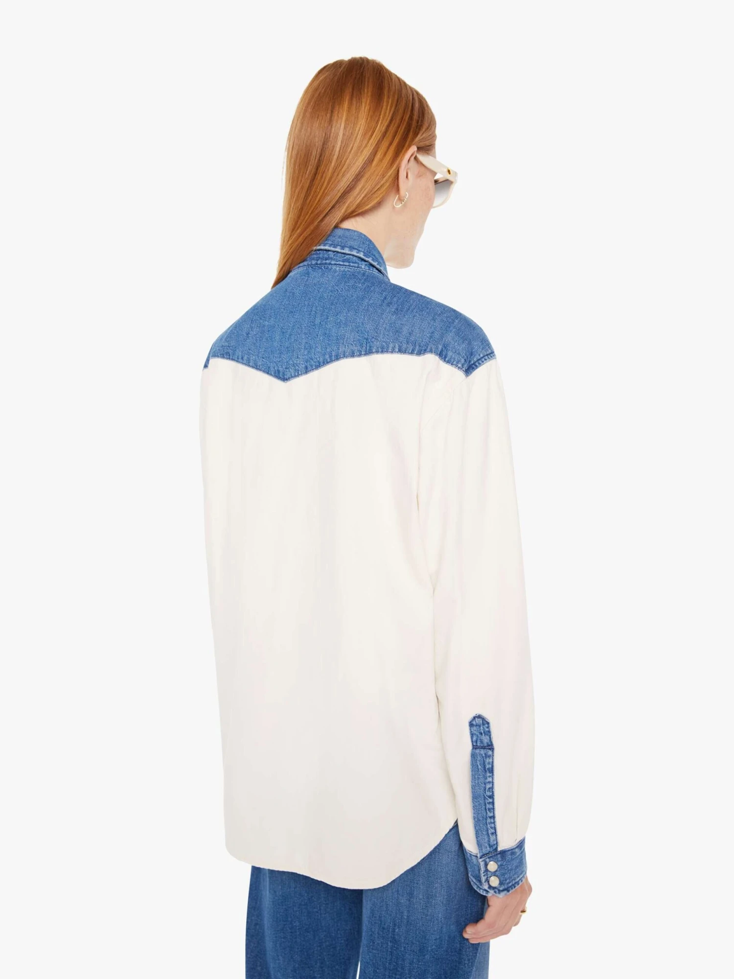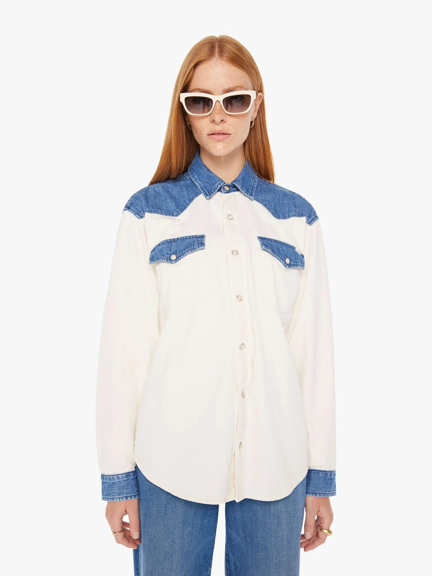 A Western-inspired denim button-up with patch pockets, a curved hem, and snaps down the front. Made from 100% cotton, the Tycoon in Shoulder To Shoulder is designed in off white with denim details at the shoulders, pockets and wrists.