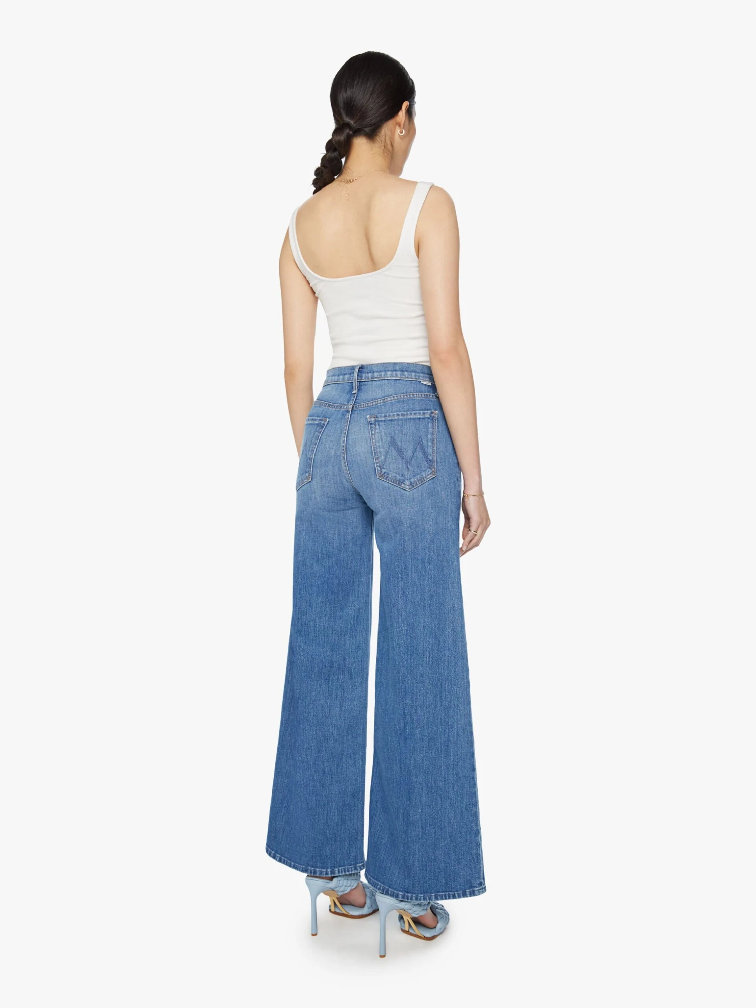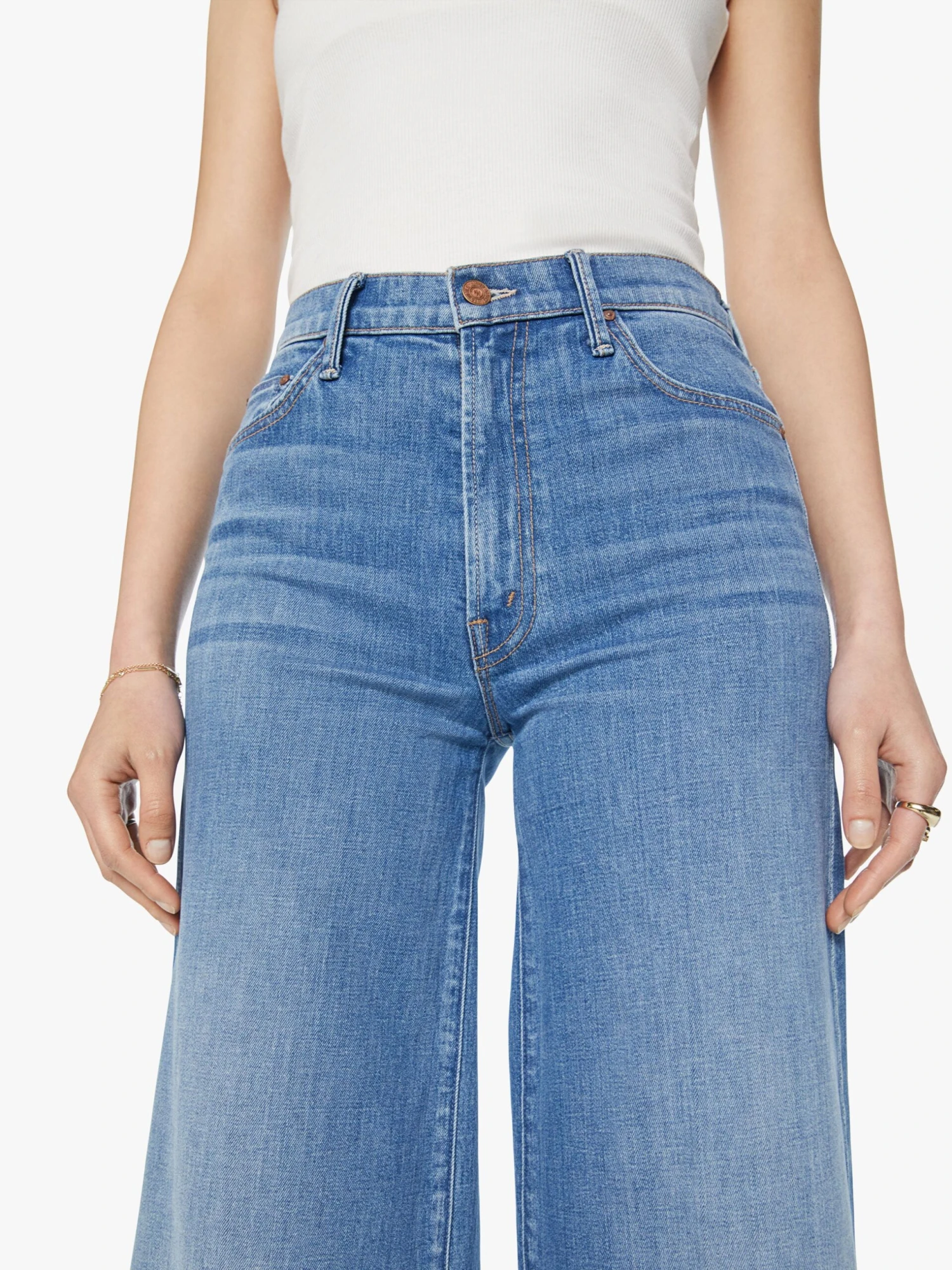 Howdy, partner. Wide leg pants with a high rise, long 32-inch inseam and a clean hem. Crafted from denim with a touch of stretch, New Sheriff In Town is a mid-blue wash with fading and whiskering.