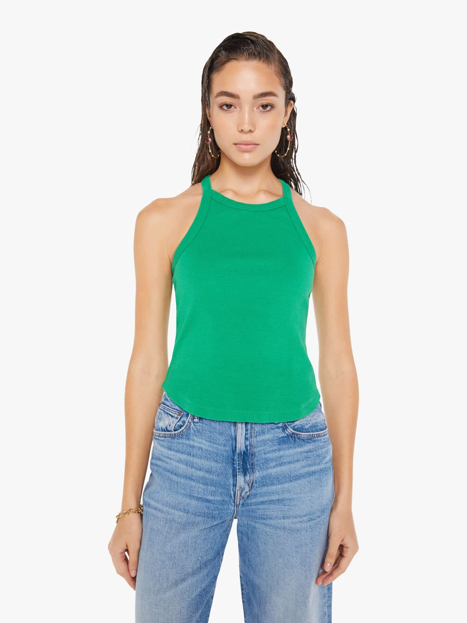 Made from a ribbed cotton blend with a touch of stretch in Golf Green, the Up In Arms tank features a slim fit, racer-style straps that cross in the back and a slightly curved hem.